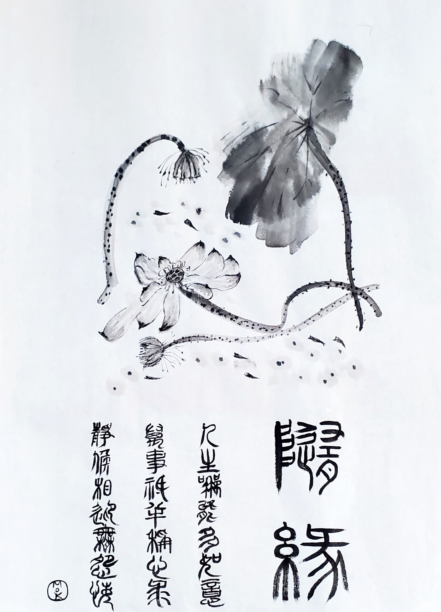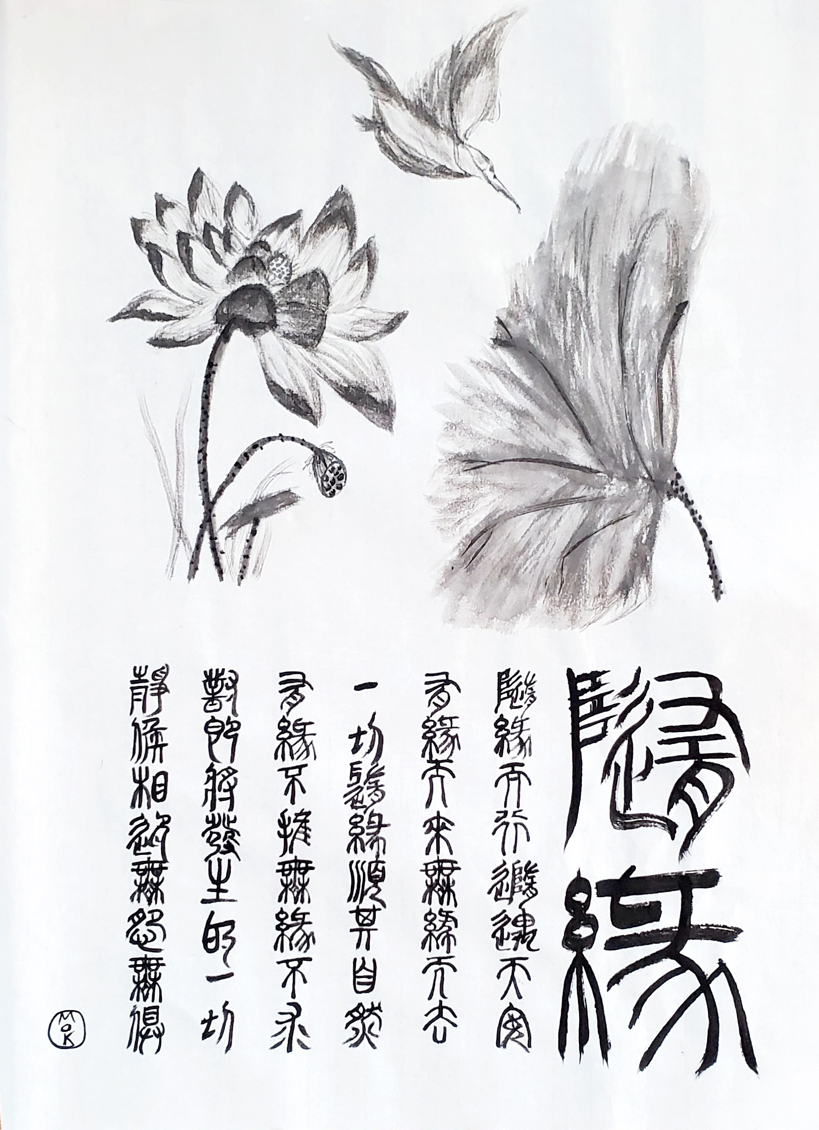 Calligraphy in Chinese: 詩. [隨緣]. 隨緣而行,隨緣而安,有緣而來, 無緣而去,一切隨緣, 順其自然,有緣不推,無緣不求,對即將發生的一切,靜候,相迎,無怨,無懼.