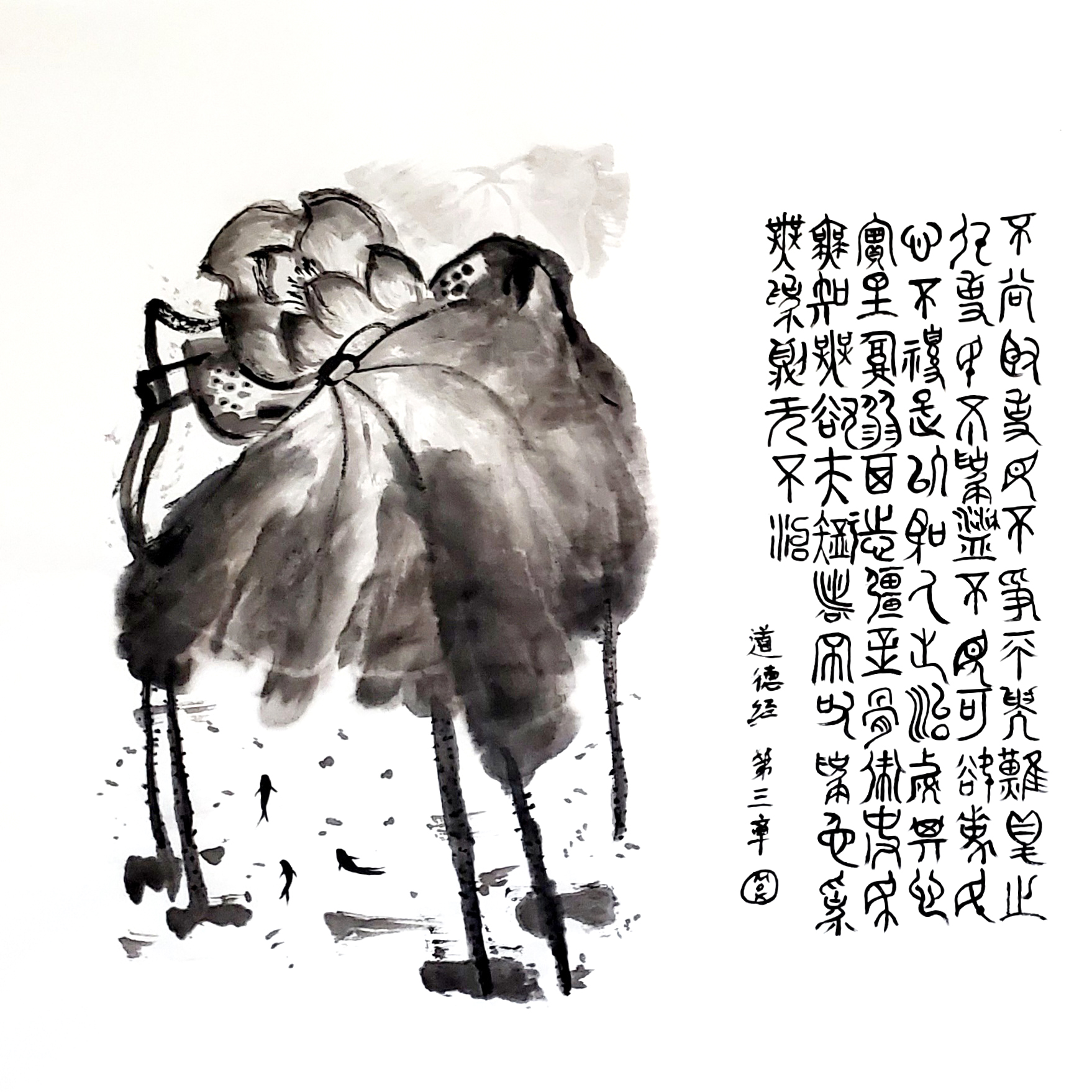 Calligraphy in English: Tao Te Ching -- 3rd Verse. By not adoring the worthy, people will not fall into dispute. By not valuing the hard to get objects, people will not become robbers. By not seeing the desires of lust, one’s heart will not be confused. Therefore the governing of the saint is to empty one’s mind, substantiate one’s virtue, weaken one’s worldly ambition and strengthen one’s essence. He lets the people to be innocent of worldly knowledge and desire, and keeps the clever ones from making trouble with their wits. Acts naturally without desire, then everything will be accomplished in its natural order.