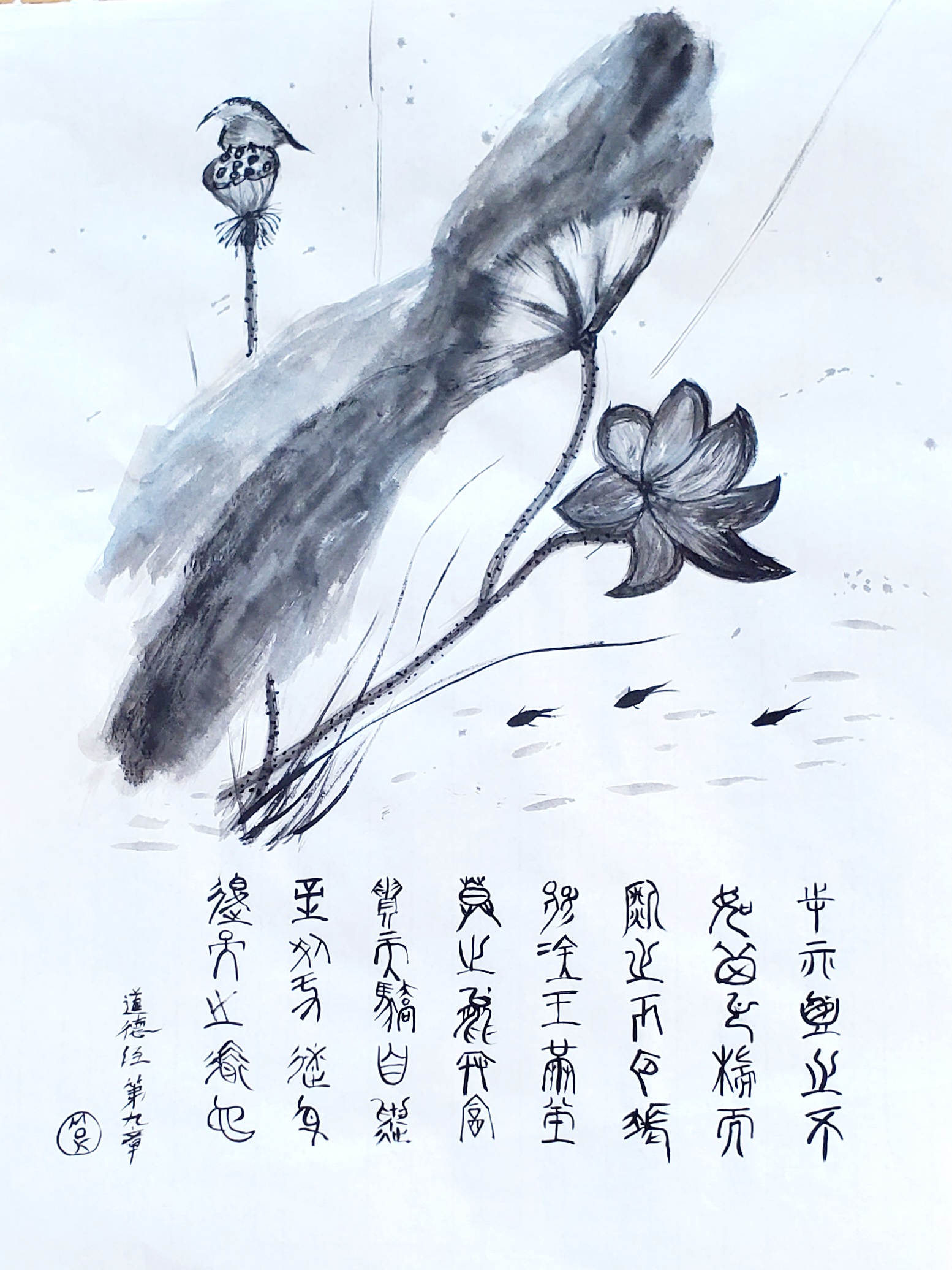 Calligraphy in Chinese: 道德經 -- 第15章: 古之善為士者,微妙玄通,深不可識。夫唯不可識,故強為之容。豫兮若冬涉川;猶兮若畏四鄰;儼兮其若容;渙兮若冰之將釋;敦兮其若樸;曠兮其若谷;混兮其若濁;孰能濁以靜之徐清?孰能安以久動之徐生?保此道者,不欲盈。夫唯不盈,故能蔽不新成。