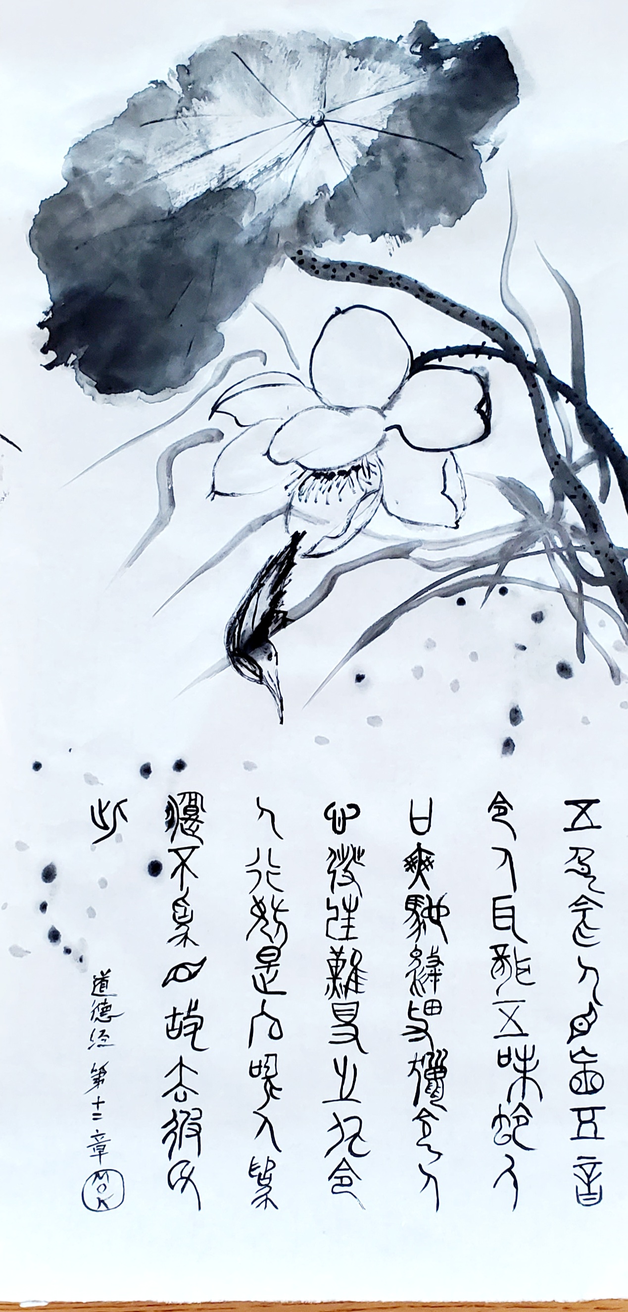 Calligraphy in English: Tao Te Ching -- 12th Verse. Colors blind the eye. Sounds deafen the ear. Flavors numb the taste. Thoughts weaken the minds. Desires wither the heart. The master observes the world but trusts his inner vision. He allows things to come and go. His heart is open as the sky.