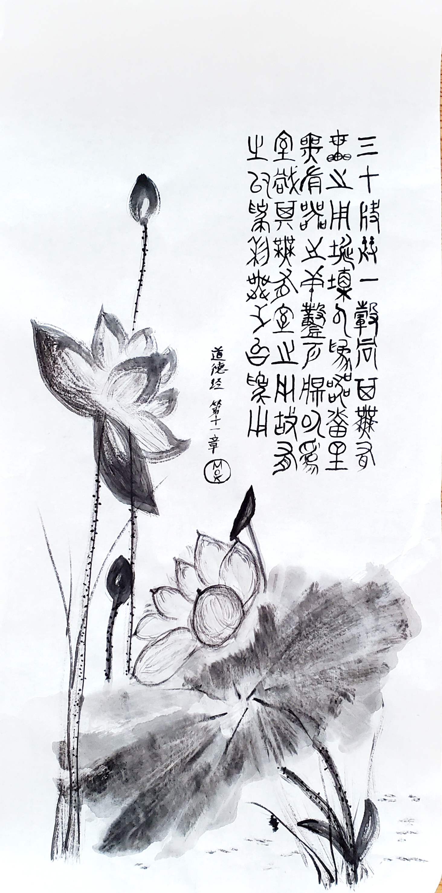 Calligraphy in Chinese: 道德經 -- 第11章. 三十輻共一轂,當其無,有車之用。埏埴以為器,當其無,有器之用。鑿戶牖以為室,當其無,有室之用。故有之以為利,無之以為用。