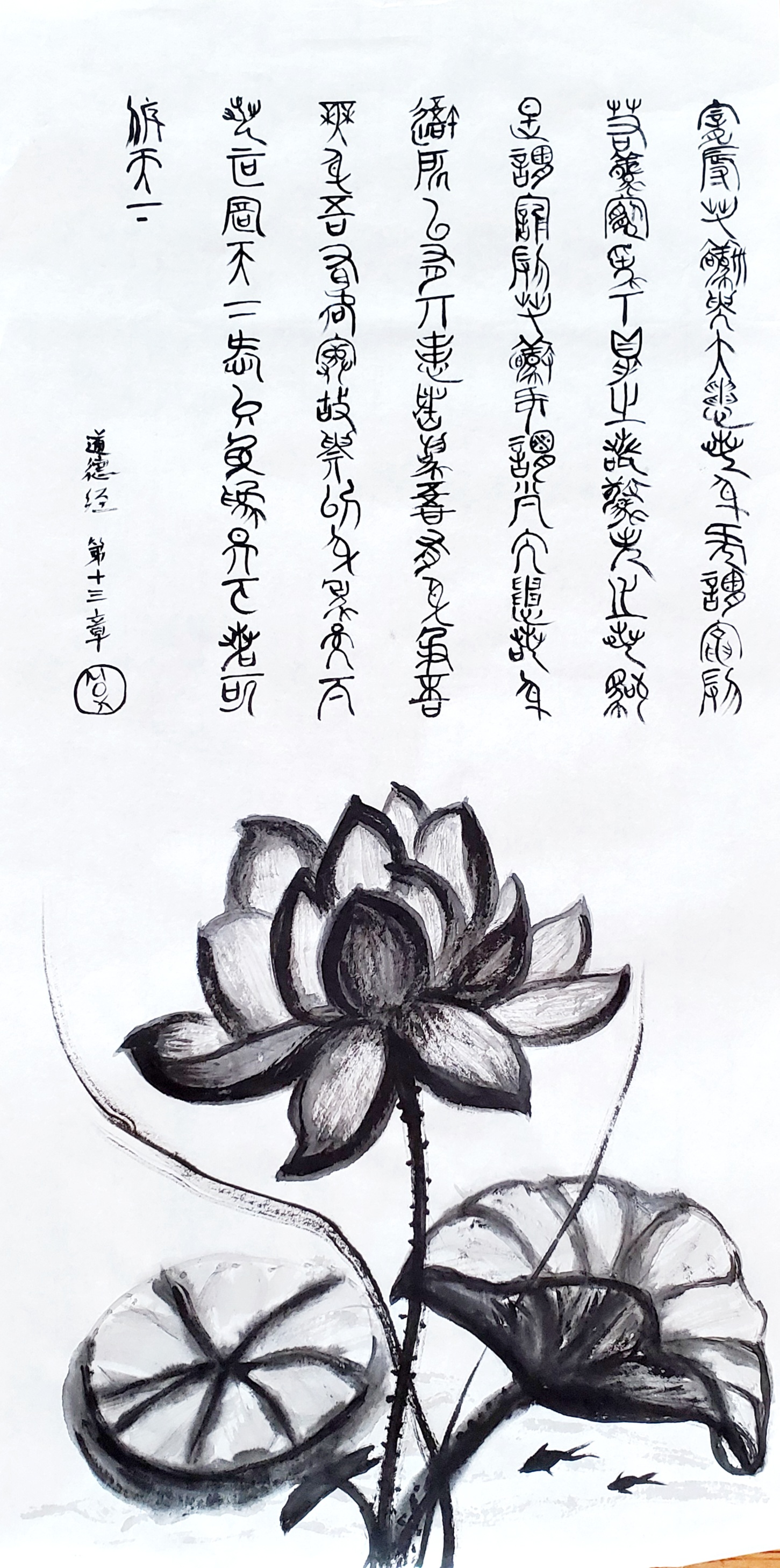 Calligraphy in Chinese: 道德經 -- 第13章: 寵辱若驚, 貴大患若身, 何謂寵辱? 寵為下, 得之若驚, 失之若驚,是謂寵辱若驚. 何謂貴大患若身? 吾所以大患者,為吾有身. 及吾無身, 吾有何患? 故,貴以身為天下, 若可寄天下; 爱以身為天下, 若可托天下.
