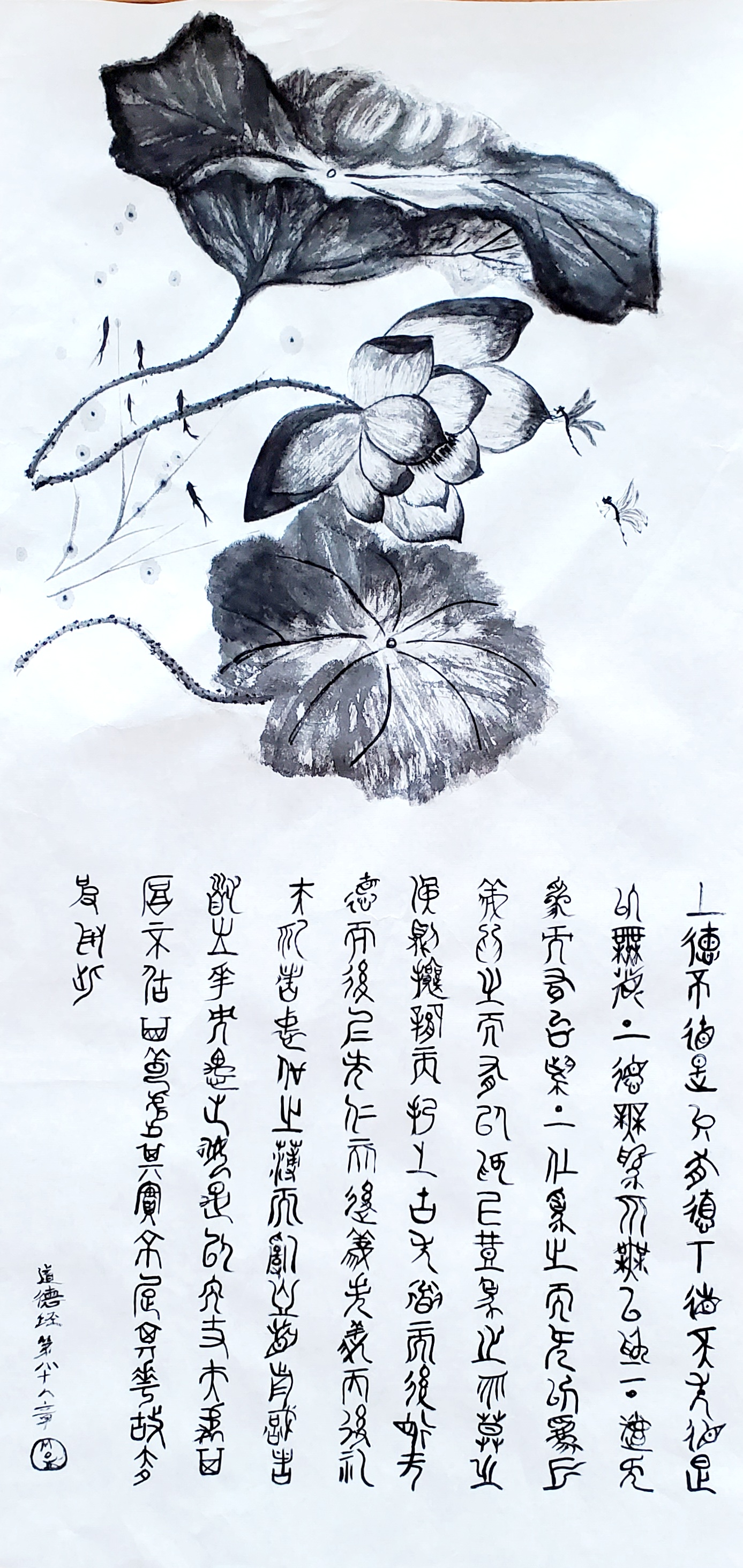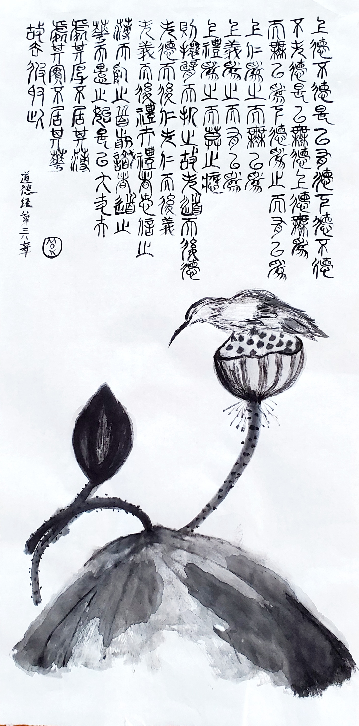 Calligraphy in Chinese: 道德經 -- 第22章. 上德不德,是以有德;下德不失德,是以無德。上德無為而無以為;下德為之而有以為。上仁為之而無以為;上義為之而有以為。上禮為之而莫之應,則攘臂而扔之。故失道而後德,失德而後仁,失仁而後義,失義而後禮。夫禮者,忠信之薄,而亂之首。前識者,道之華,而愚之始。是以大丈夫處其厚,不居其薄;處其實,不居其華。故去彼取此。