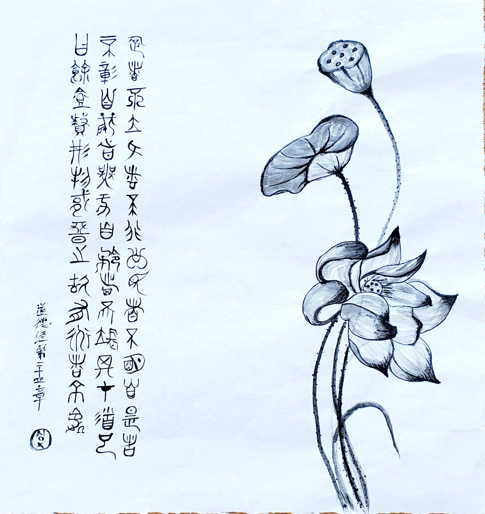 Calligraphy in English: 《Avatamsaka Sutra》 A true and honest heart is issued, The Six External Bases are all Dharma, All motes of dust are the Dharma Realm, All forms are manifested by Buddha, The dust and earth without interruption, every moment is cultivation.