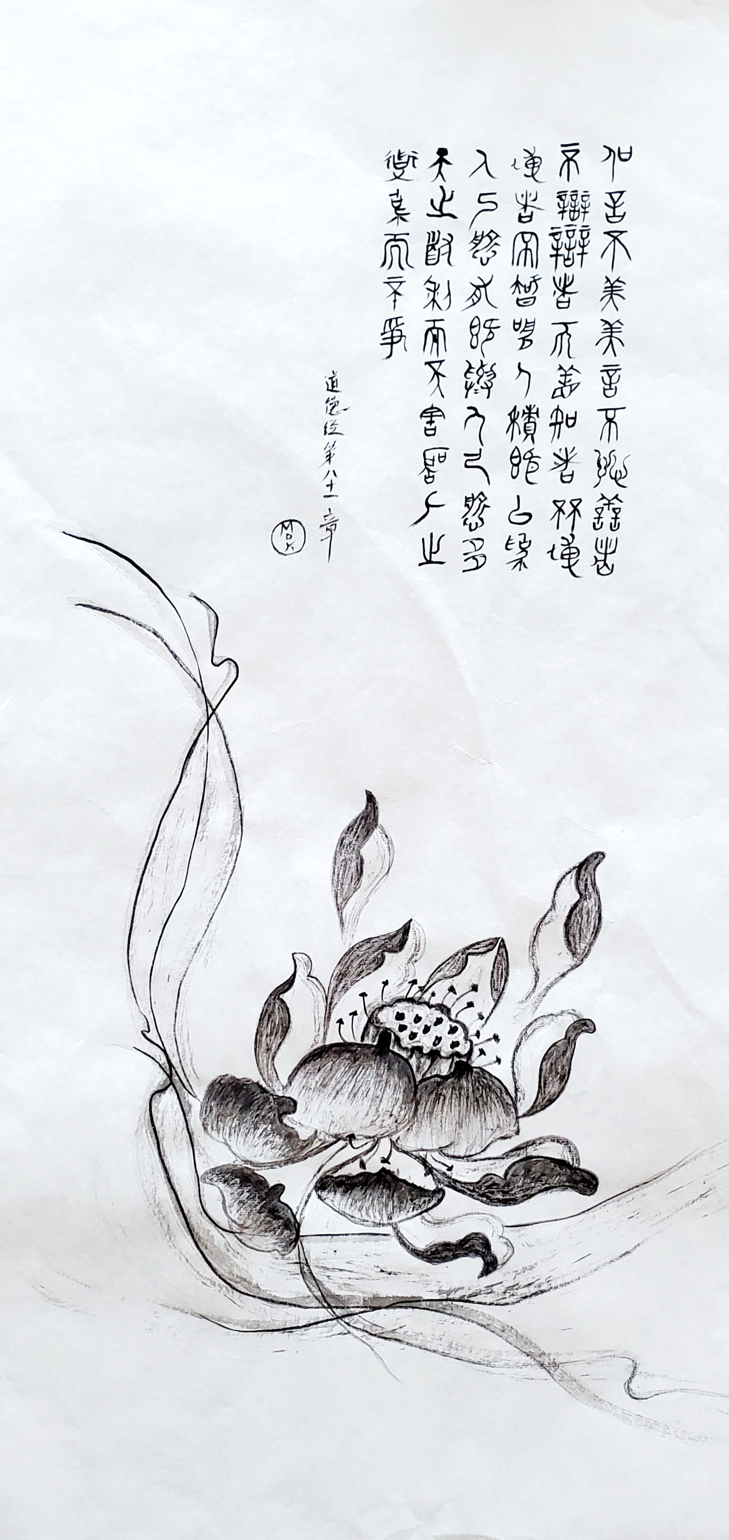 Calligraphy in English: Tao Te Ching -- 15th Verse. The ancient masters were profound and subtle. The wisdom as unfathomable. There is no way to describe it; all we can describe is their appearance. They were careful as someone crossing an iced-over stream. Alert as a warrior in enemy territory. Courteous as a guest. Fluid as melting ice. Shapeable as a block of wood. Receptive as a valley. Clear as glass of water. Do you have the patience to wait till your mud settle and the water is clear? Can you remain unmoving still the right action arises by itself? The master doesn’t seek fulfillment. Not seeking, not expecting, she is present, and can welcome all things.