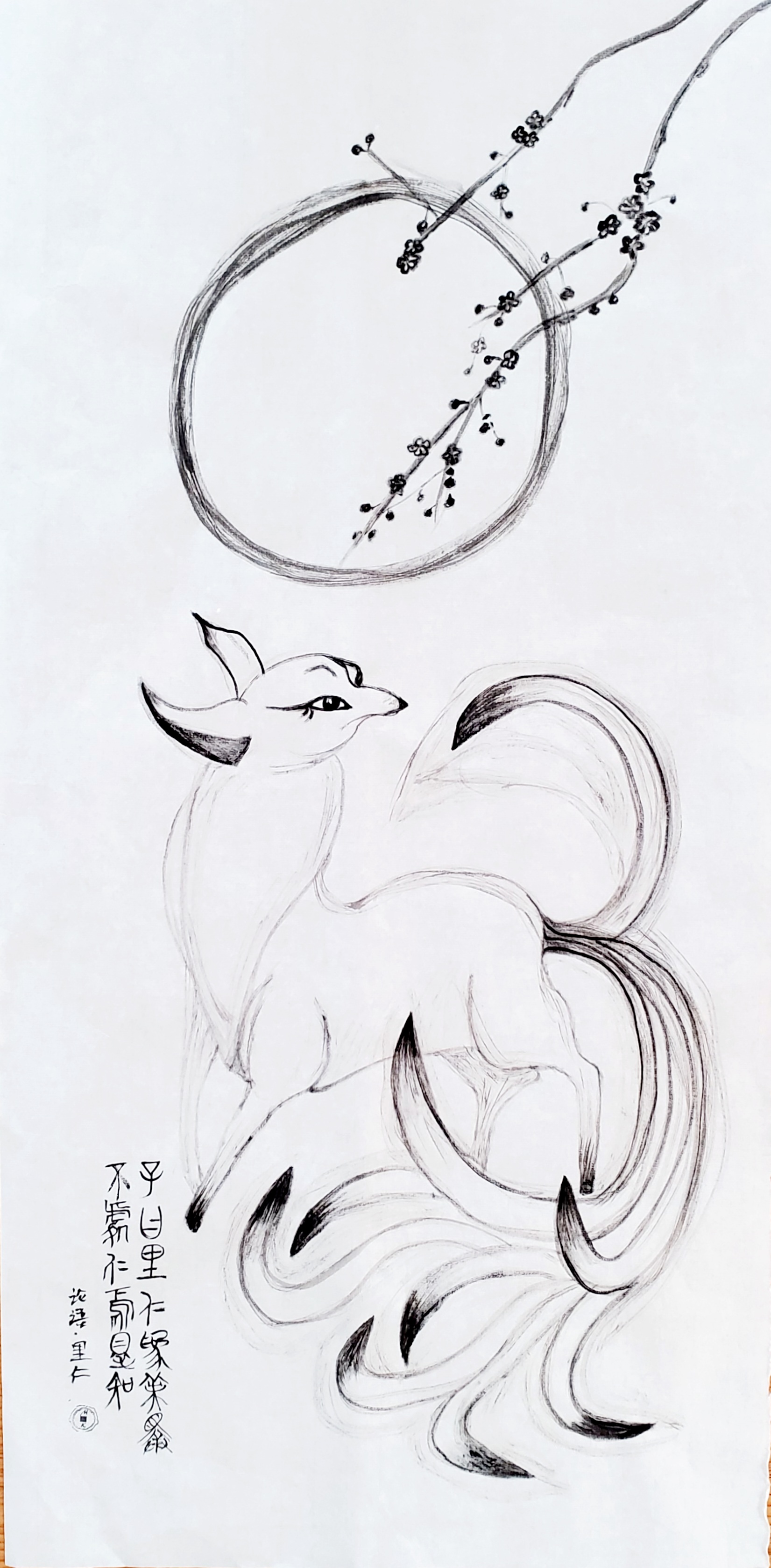 Calligraphy in Chinese: 詩. 《梅花》. 墙角数枝梅,凌寒独自开。 遥知不是雪,为有暗香来.